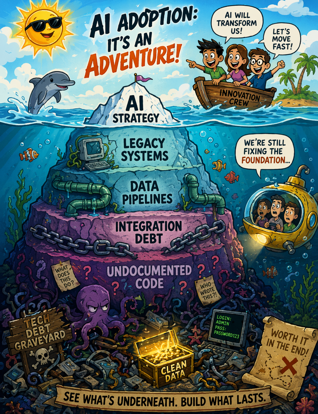 The illustration appears straightforward at first glance: a mountain peak labeled “AI Strategy” rises above the waterline, shining in the sunlight. A group of enthusiastic executives on a boat gestures toward it, enthusiastically declaring, “AI will transform us!” and “Let’s move quickly!” However, below the surface lies a very different reality. A large, submerged mass reveals legacy systems, data pipelines, and integration challenges. At the very bottom, in a raw, anxious red, is undocumented code filled with question marks, explored by a small submarine crew still attempting to map what lies beneath.